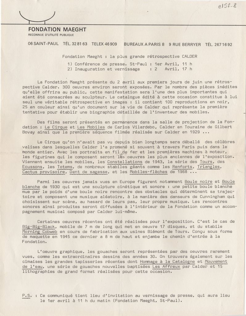 Φωτοαντίγραφο δακτυλόγραφου δελτίου Τύπου, χαρτί, 27×21 εκ., στα γαλλικά, αναδρομικής έκθεσης του Alexander Calder, η οποία διοργανώνεται στην Fondation Maeght στο Παρίσι. Αναγράφονται λεπτομέρειες για τη διοργάνωση και τα έργα που παρουσιάζονται.