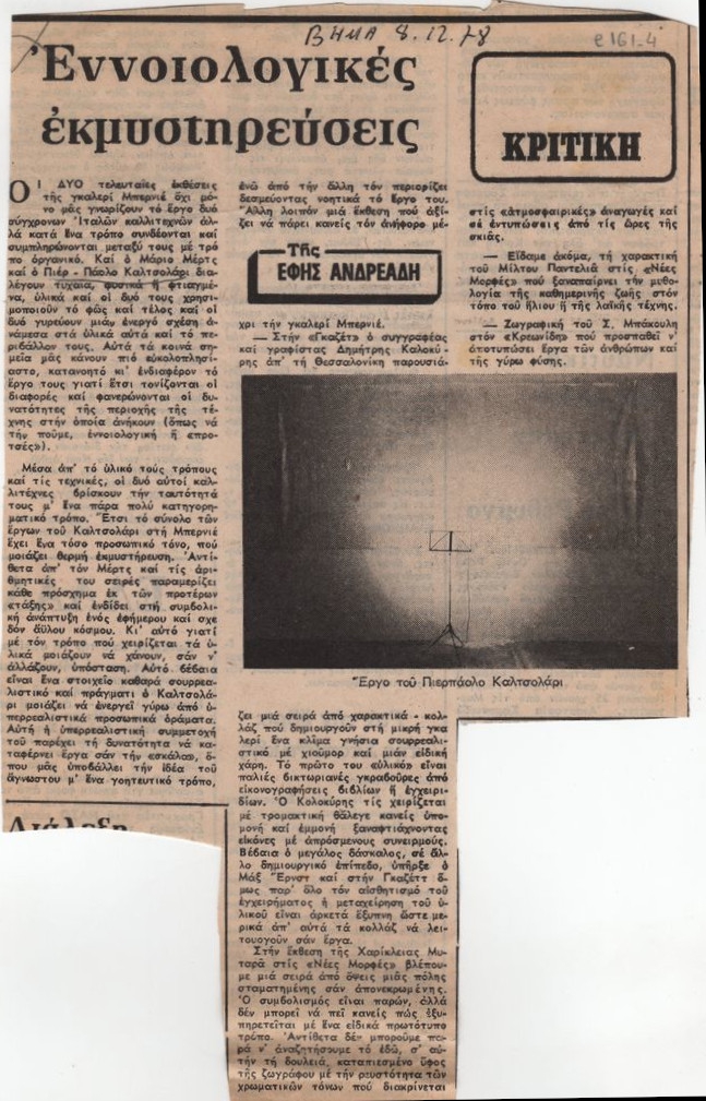 Απόκομμα, έντυπο, χαρτί, 24,0×15,0 εκ., όπου δημοσιεύεται, στα ελληνικά, κριτική της Έφης Ανδρεάδη για τις ατομικές εκθέσεις των Mario Merz, Pier Paolo Calzolari, Δημήτρη Καλοκύρη, Χαρίκλειας Μυταρά, Μίλτου Παντελιά και Σεραφείμ Μπάκουλη στην Αθήνα τον χειμώνα του 1978. Επάνω, επιγραφή με τα στοιχεία της δημοσίευσης.