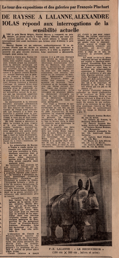 Απόκομμα, έντυπο, χαρτί, 52,0×37,7 εκ., όπου δημοσιεύεται, στα γαλλικά, συνέντευξη του Αλέξανδρου Ιόλα στον François Pluchart. Στην ίδια σελίδα, δημοσιεύεται άρθρο του Jean-Albert Cartier για τον εξπρεσιονιστή ζωγράφο, Charles Camoin, με αφορμή την έκθεση έργων του στη γενέτειρά του Μασσαλία το 1966 και αναγγελίες εκθέσεων της περιόδου.