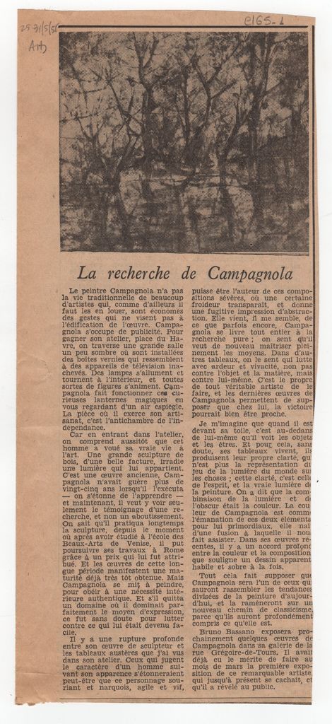 Απόκομμα, έντυπο, χαρτί, 26,2×11,2 εκ., όπου δημοσιεύεται, στα γαλλικά, άρθρο για τον ιταλό γλύπτη και ζωγράφο Enrico Campagnola με αφορμή την έκθεση έργων του στο Παρίσι το 1955. Επάνω αριστερά, επιγραφή με τα στοιχεία της δημοσίευσης.