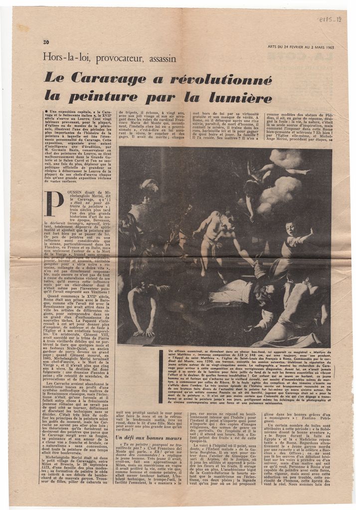 Απόκομμα, χαρτί, 2 φφ διπλής όψης, στα γαλλικά, 42×30 εκ., κειμένου αφιερωμένου στη ζωγραφική του Michelangelo da Caravaggio και στην επιρροή του καλλιτέχνη σε μεταγενέστερους από αυτόν ζωγράφους. Αφορμή έκθεση η οποία διοργανώνεται στο Λούβρο και είναι αφιερωμένη στον καλλιτέχνη.