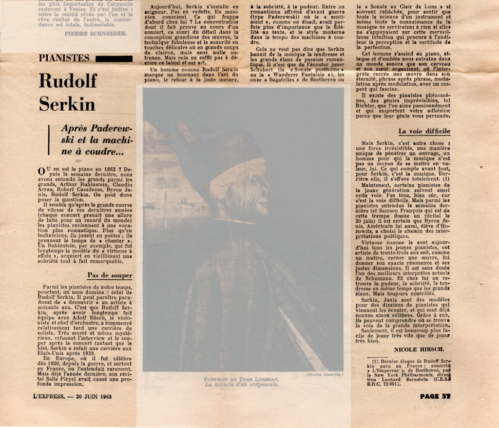 Απόκομμα, έντυπο, χαρτί, 42,5×29,0 εκ., όπου δημοσιεύεται, στα γαλλικά, άρθρο της Nicole Hirsch για τον Βοημό πιανίστα Rudolf Serkin. Στο ίδιο απόκομμα δημοσιεύονται επίσης τα εξής άρθρα: Pierre Schneider “Vittore Carpaccio”, J.-F. C. “Expositions Vieira da Silva. Les gouaches de Gilberte Rongier”, Jean-Francois Chabrun “Jacques Villon”, Claude Tarare “De la peinture animée”, Robert Kanters “Hamlet chez Camus” και αναγγελίες εκθέσεων της περιόδου.