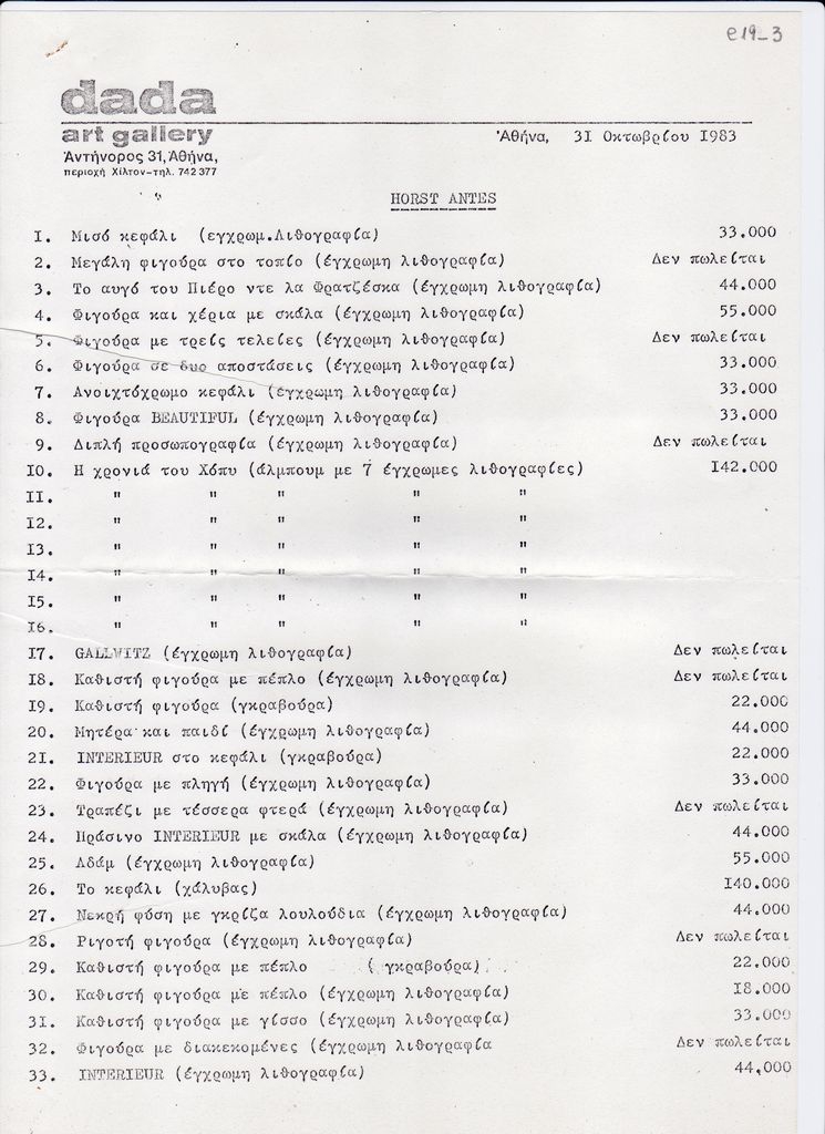Κείμενο, δακτυλόγραφο, στα ελληνικά, σε χαρτί της Dada Art Gallery, 2 φφ., 29,7×21,0 εκ. Τιμοκατάλογος έργων της ατομικής έκθεσης χαρακτικής και λιθογραφίας του Horst Antes στην Αθήνα το 1983.