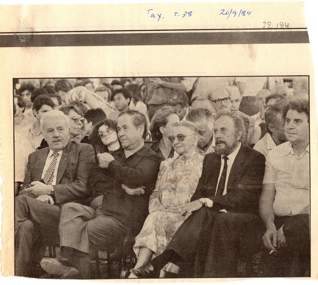Ο Χαρ. Φλωράκης, ο χαράκτης Τάσσος, η Έλλη Αλεξίου, ο Γ. Ρίτσος και ο Μίκης Θεοδωράκης στην τελετή έναρξης του 10ου Φεστιβάλ της ΚΝΕ-«Οδηγητή»