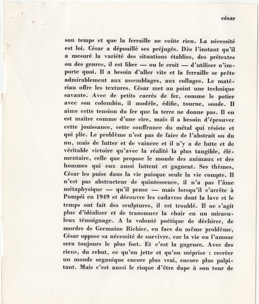 Απόκομμα εντύπου, χαρτί, 6 φφ, 21×18 εκ., στα γαλλικά, με κείμενο για τον César (Baldaccini) και βιογραφικό σημείωμα του καλλιτέχνη.