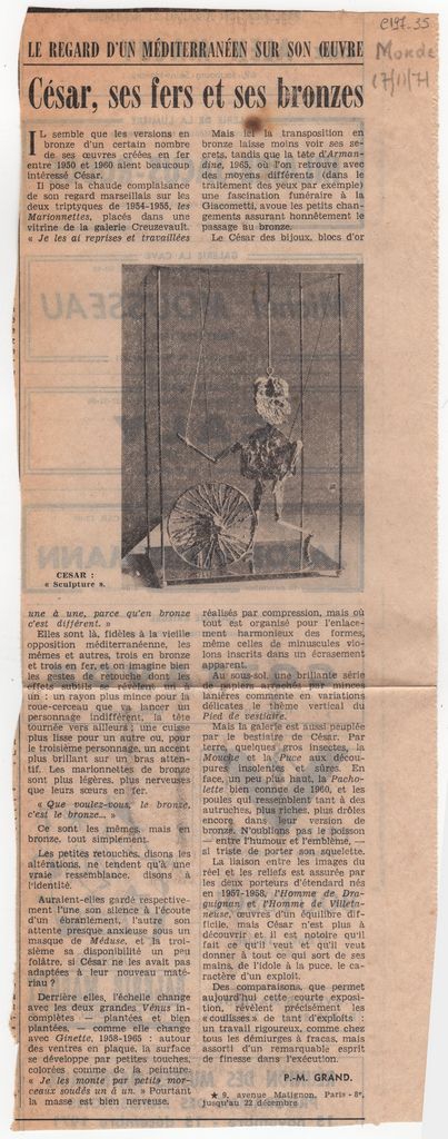Απόκομμα, χαρτί, 32×12 εκ., στα γαλλικά, δημοσίευσης κριτικής έκθεσης του César (Baldaccini), η οποία διεξάγεται στην γκαλερί Creuzevault στο Παρίσι.