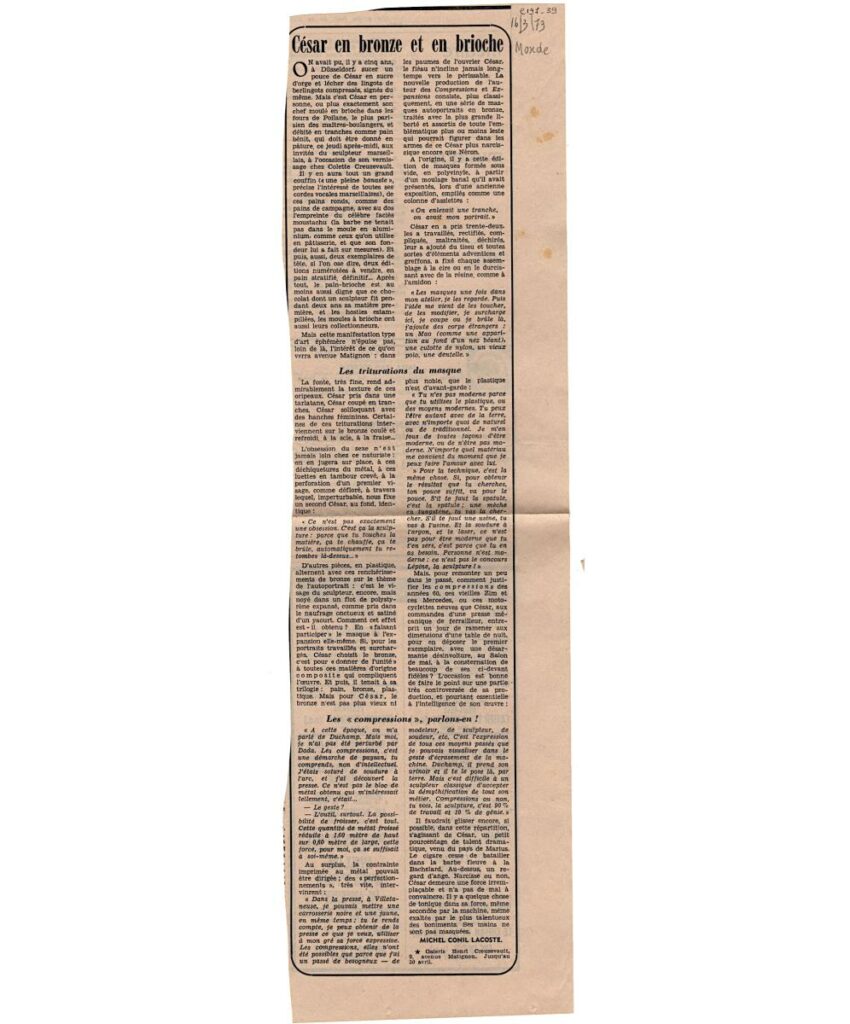 Απόκομμα, χαρτί, 44×12 εκ., στα γαλλικά, δημοσίευσης κριτικής έκθεσης του César (Baldaccini) στην Galerie Creuzevault στο Παρίσι.