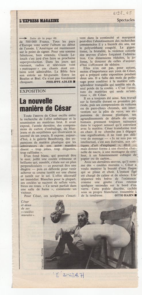 Απόκομμα, χαρτί, 28×13 εκ., στα γαλλικά, δημοσίευσης κριτικής έκθεσης του César (Baldaccini) στο Παρίσι. Δίνονται πληρφορίες και σχολιάζονται τα έργα που παρουσιάζονται σε αυτή.