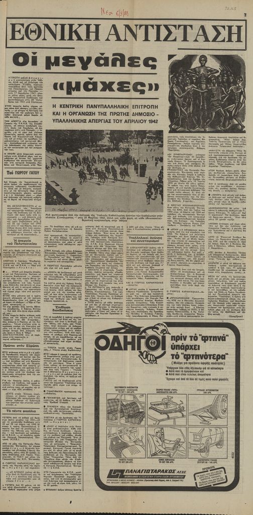 Απόκομμα, έντυπο, στα ελληνικά, χαρτί, διπλής όψης, 63×32 εκ. Πάνω από τον τίτλο, επιγραφή, στα ελληνικά. Στο ίδιο απόκομμα: μικρές αγγελίες.