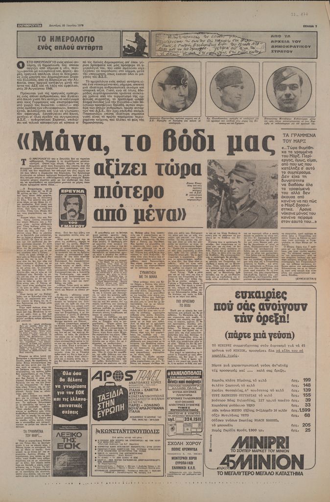 Απόκομμα, έντυπο, στα ελληνικά, χαρτί, διπλής όψης, 63×45 εκ. Εντάσσεται στη στήλη “Το ημερολόγιο ενός απλού αντάρτη”. Στο ίδιο απόκομμα: διαφημίσεις και μικρές αγγελίες.