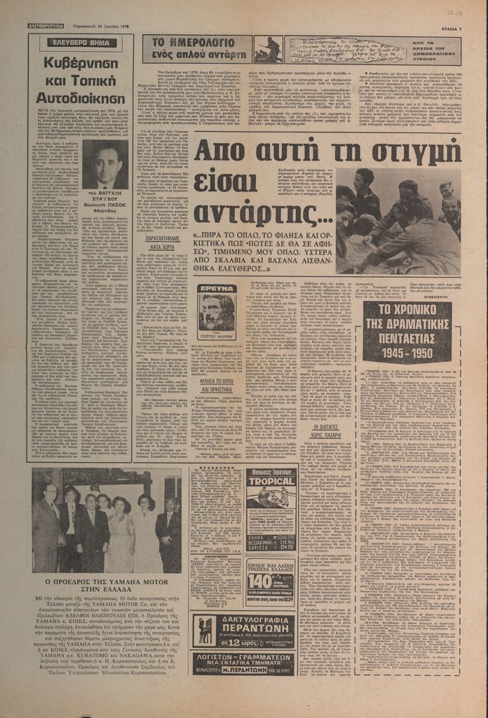 Απόκομμα, έντυπο, στα ελληνικά, χαρτί, διπλής όψης, 64×42,5 εκ. Εντάσσεται στη στήλη “Το ημερολόγιο ενός απλού αντάρτη”. Στο ίδιο απόκομμα: “Το χρονικό της δραματικής πενταετίας 1945-1950”, επικαιρότητα, διαφημίσεις και μικρές αγγελίες.