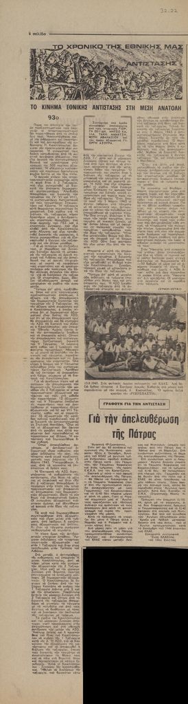 Απόκομμα, έντυπο, στα ελληνικά, χαρτί, διπλής όψης, 64×17 εκ. Στο ίδιο απόκομμα: “Για την απελευθέρωση της Πάτρας” και επικαιρότητα.