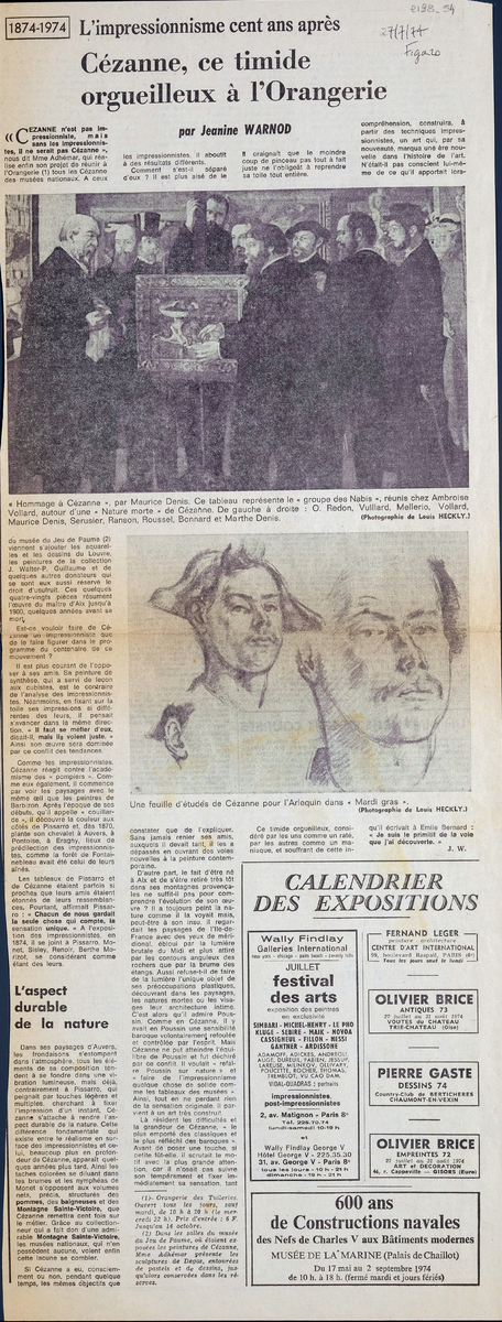 Απόκομμα, χαρτί, 60×21 εκ., στα γαλλικά, δημοσίευσης κριτικής έκθεσης έργων του Paul Cézanne, η οποία διεξάγεται στην Orangerie στο Παρίσι. Παρουσιάζονται τα έργα του καλλιτέχνη που εντάσσονται στις συλλογές των γαλλικών μουσείων. Δίνονται πληροφορίες για τη διοργάνωση από την H. Adhémar, διοργανώτρια της έκθεσης. Στο ίδιο “Calendrier des Expositions”, με αναφορές σε εκθέσεις της περιόδου, ανάμεσα στις οποίες του Olivier Brice, Fernand Léger, Pierre Gaste, θεματικής για τις ναυτικές κατασκευές και φεστιβάλ τέχνης με εκθέσεις καλλιτεχνών στις γκαλερί Wally.