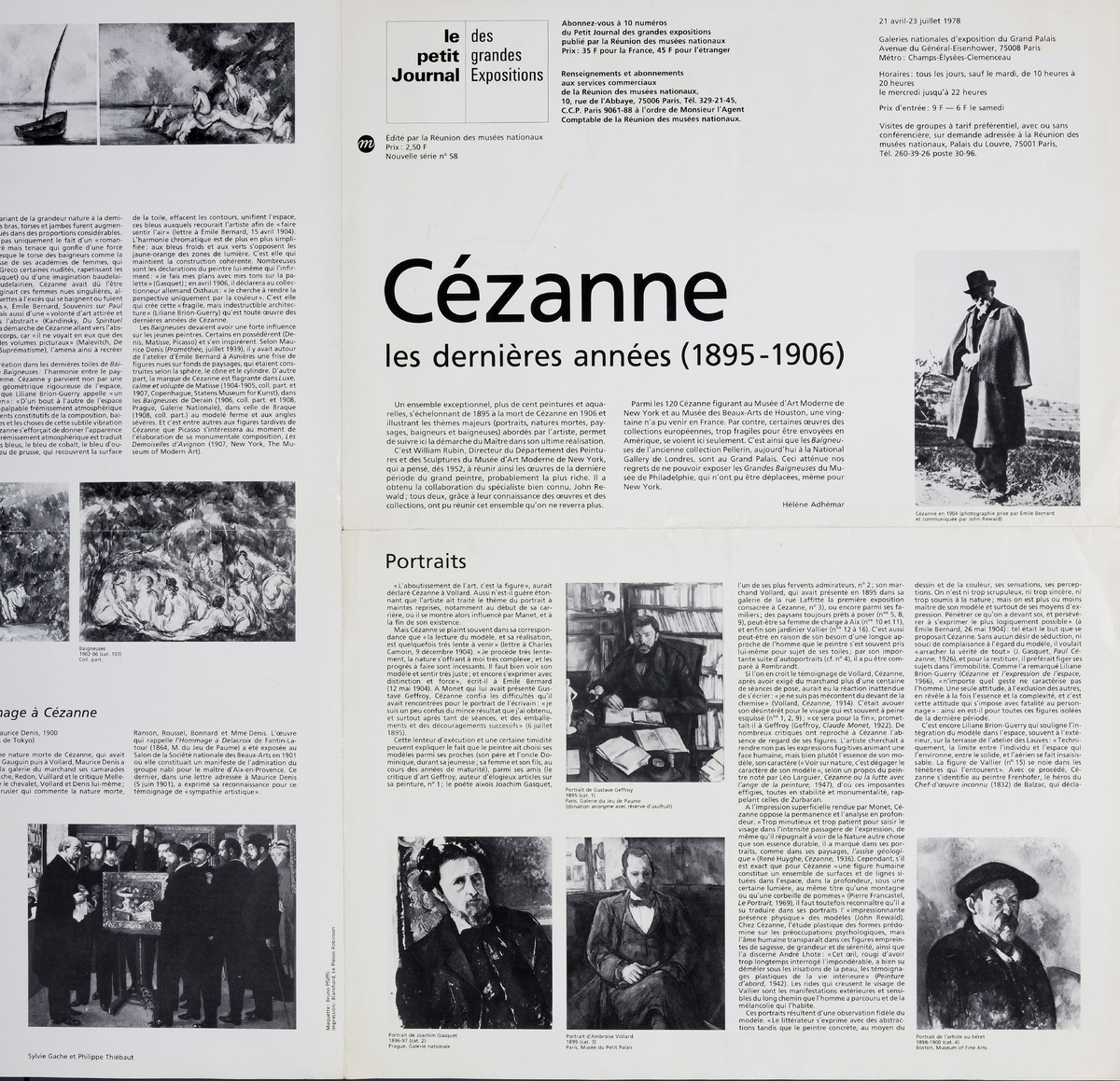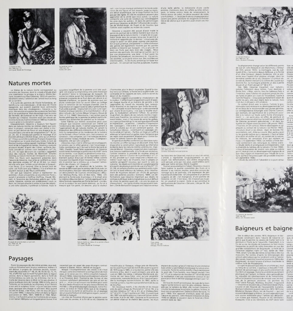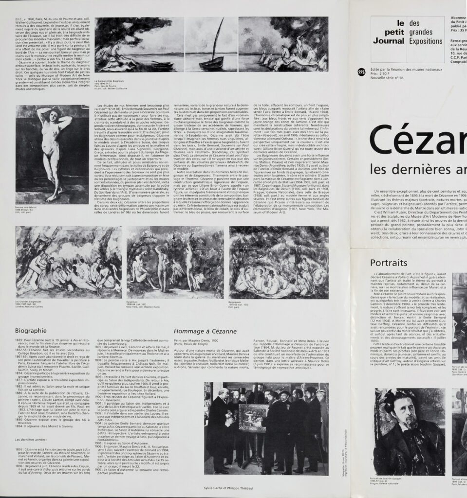 Έντυπο, χαρτί ιλλουστρασιόν αναδιπλωμένο, 35×32 εκ., στα γαλλικά, αφιερωμένο στην έκθεση του Paul Cézanne “Cézanne, les dernières années”, η οποία διεξάγεται στο Grand Palais στο Παρίσι. Περιέχει κείμενο για τη διοργάνωση και για τα έργα που παρουσιάζονται και βιογραφία του καλλιτέχνη.