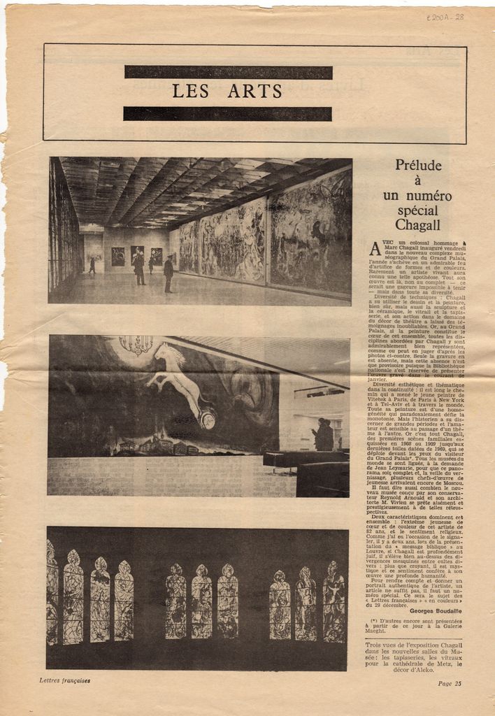 Απόκομμα, χαρτί, 42×30 εκ., στα γαλλικά, δημοσίευσης άρθρου αναφερόμενου σε αναδρομική έκθεση έργων του Marc Chagall η οποία διοργανώνεται στο Grand Palais στο Παρίσι. Δίνονται πληροφορίες για τη διοργάνωση και τα έργα που παρουσιάζονται σε αυτή.