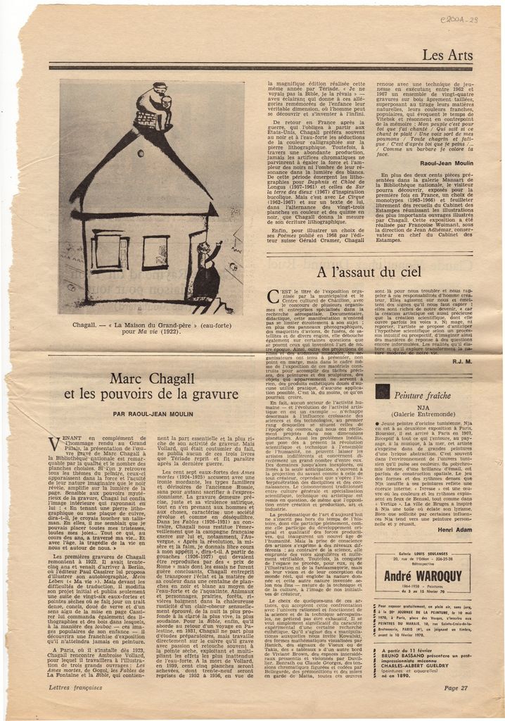 Απόκομμα, χαρτί, 42×30 εκ., στα γαλλικά, δημοσίευσης κριτικής έκθεσης χαρακτικών του Marc Chagall, η οποία διεξάγεται στην Εθνική Βιβλιοθήκη της Γαλλίας. Δίνονται πληροφορίες και σχόλια για την έκθεση ενώ γίνεται μια αναδρομή στο εικαστικό έργο του καλλιτέχνη.