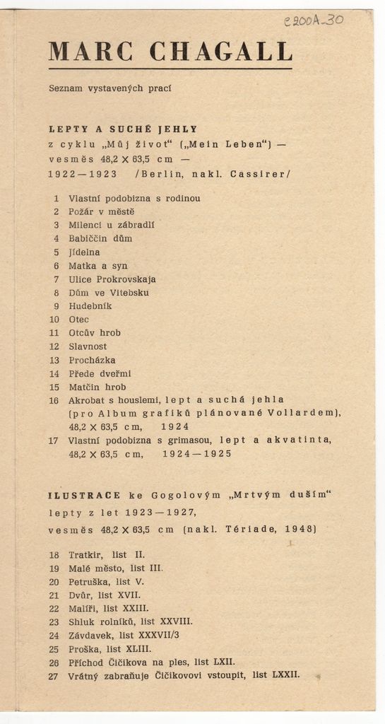 Έντυπο, χαρτόνι αναδιπλωμένο, 22×11 εκ., στα τσέχικα και γαλλικά, έκθεσης του Marc Chagall. Αναγράφονται τα έργα που παρουσιάζονται.