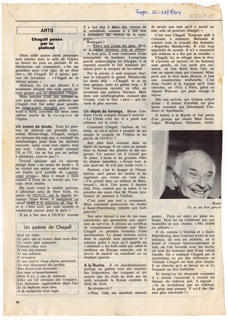 Απόκομμα, χαρτί, 2 φφ, 28×21 και 28×13 εκ., στα γαλλικά, δημοσίευσης άρθρου αφιερωμένου στον Marc Chagall. Δίνονται πληροφορίες για τη ζωή και το εικαστικό του έργο, σημειώνεται η επισκεψιμότητα του Palais Garnier στο Παρίσι, όπου φιλοτέχνησε την οροφή και αναγράφεται ποίημά του και δηλώσεις-σκέψεις του.
