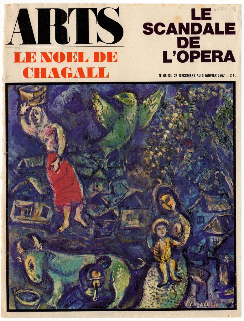 Απόκομμα, χαρτί διπλής όψης, 5 φφ, 28×21 εκ., στα γαλλικά, δημοσίευσης κειμένου αφιερωμένου στον Marc Chagall, με αφορμή την συμπλήρωση 80 χρόνων από τη γέννηση του. Εντάσσεται σε αφιέρωμα του εντύπου για τον καλλιτέχνη.