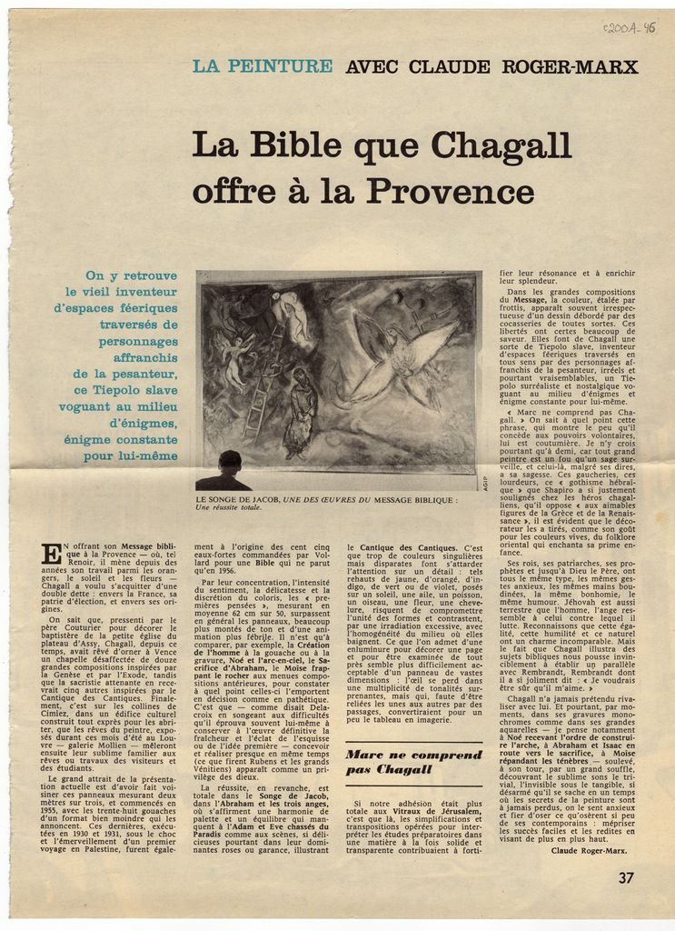 Απόκομμα, χαρτί, 35×27 εκ., στα γαλλικά, δημοσίευσης άρθρου το οποίο αναφέρεται στο “Message Biblique” του Marc Chagall. Δίνονται πληροφορίες σχετικά με το έργο και τη διαδικασία που ακολούθησε ο καλλιτέχνης για τη δημιουργία του.
