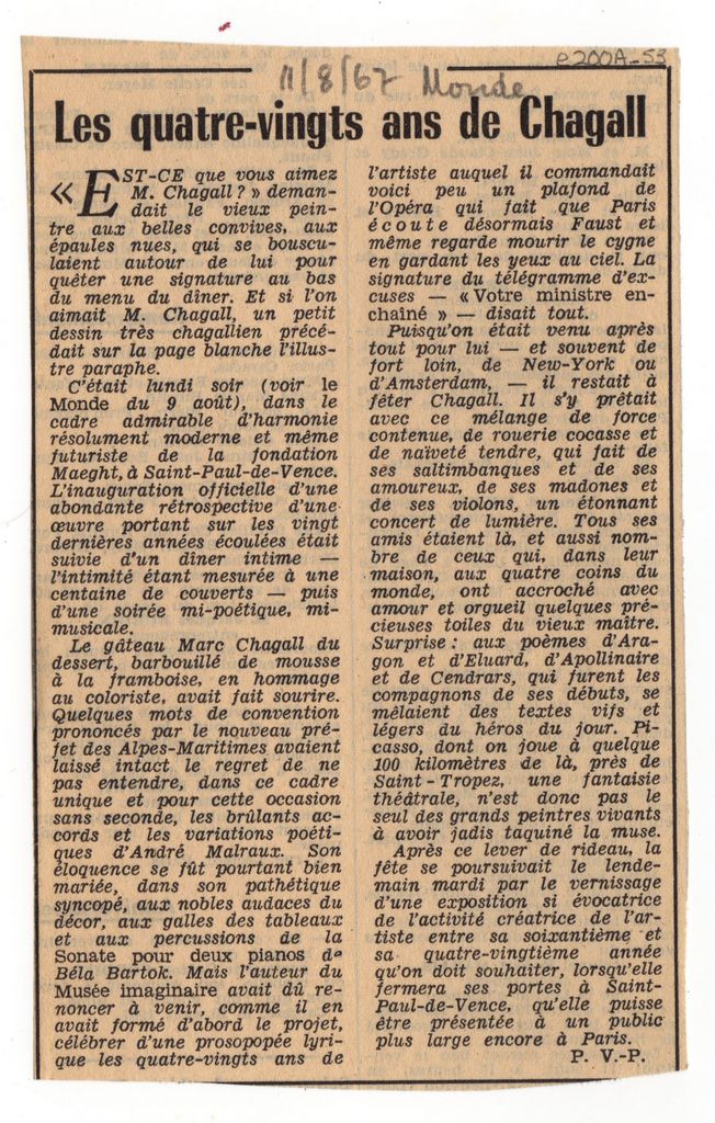 Απόκομμα, χαρτί, 15.5×10 εκ., στα γαλλικά, δημοσίευσης άρθρου αναφερόμενου στη συμπλήρωση 80 χρόνων από τη γέννηση του Marc Chagall και σε έκθεση αφιερωμένη στον καλλιτέχνη στην Fondation Maeght. Δίνονται πληροφορίες για τα εγκαίνιά της.