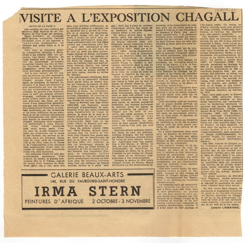 Απόκομμα, χαρτί, 2 φφ, 60×10 και 26×27 εκ., στα γαλλικά, δημοσίευσης κριτικής έκθεσης του Marc Chagall, στο Μουσείο Μοντέρνας Τέχνης στο Παρίσι. Αναγράφονται πληροφορίες και σχόλια για τα έργα που παρουσιάζονται. Επίσης, αναφορά σε έκθεση της Irma Stern.
