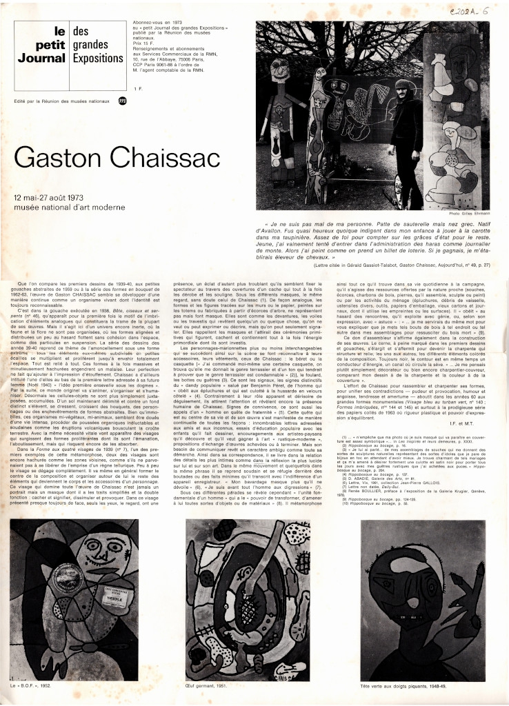 Έντυπο, στα γαλλικά, δίπτυχο, χαρτί ιλουστρασιόν, 45,0×32,5 εκ. αφιερωμένο στην αναδρομική έκθεση έργων του Γάλλου εικαστικού Gaston Chaissac στο Παρίσι το 1973. Περιέχει κείμενα για τον καλλιτέχνη από τους Isabelle Fontaine και Marielle Tabart, αποσπάσματα επιστολών του καλλιτέχνη σε φίλους του και βιογραφικό του καλλιτέχνη.