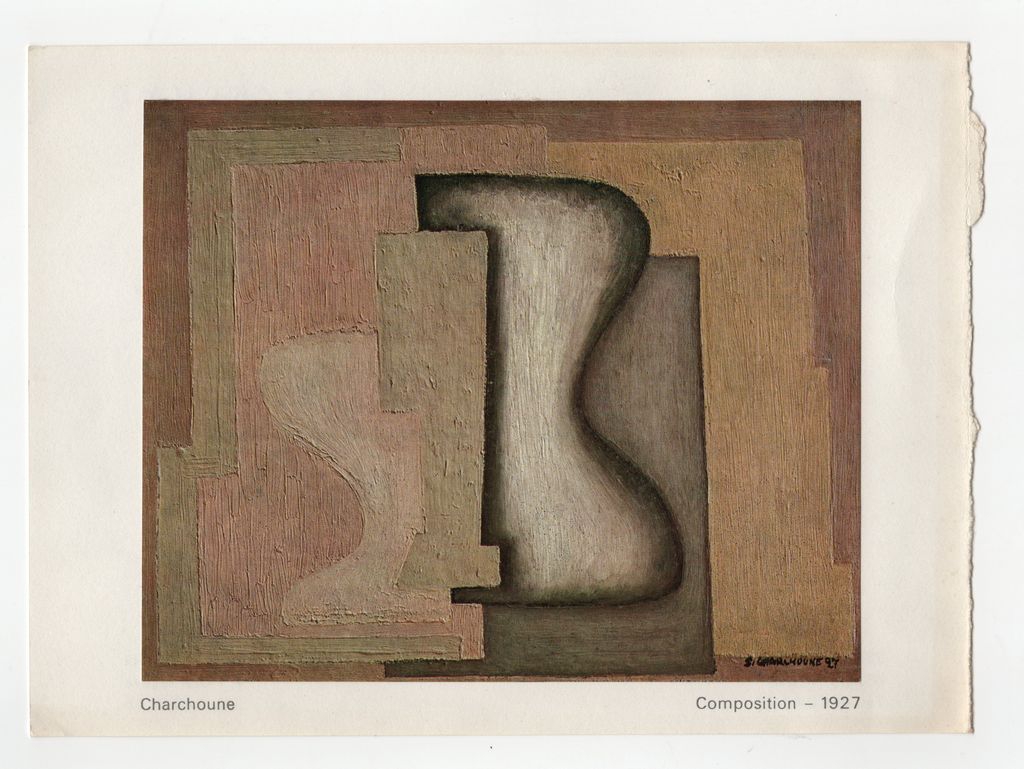 Απόκομμα, έντυπο, χαρτόνι ιλουστρασιόν, 15,5×21,0 εκ. Στη μία όψη, αναπαραγωγή έργου του Serge Charchoune. Στην άλλη όψη, επιγραφή με το όνομα του καλλιτέχνη.