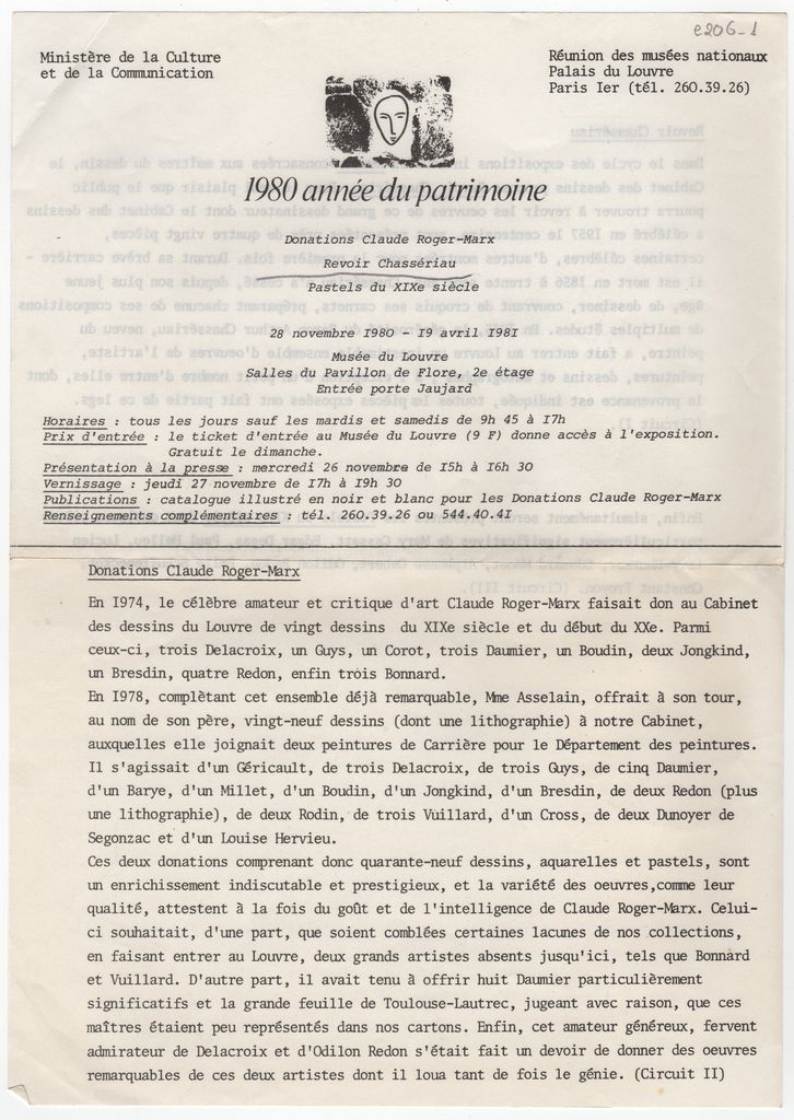 Κείμενο, στα γαλλικά, δακτυλόγραφο, χαρτί, 29,6×21,0 εκ. Δελτίο τύπου τριών εκθέσεων που διοργανώθηκαν στο πλαίσιο των εκδηλώσεων 1980 Année du Patrimoine με τίτλο “Donations Claude Roger-Marx”, “Revoir Chassériau” και “Pastels du XIXe siècle” στο Παρίσι το 1980/1.