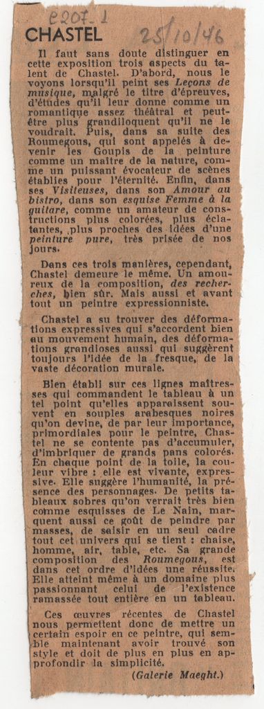 Απόκομμα, έντυπο, χαρτί, 15,8×4,6 εκ., όπου δημοσιεύεται, στα γαλλικά, κριτική της ατομικής έκθεσης έργων του Roger Chastel στο Παρίσι το 1946. Επάνω, επιγραφή με την ημερομηνία δημοσίευσης.