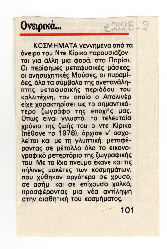 Απόκομμα, χαρτί, 10×7 εκ., στα ελληνικά, δημοσίευσης άρθρου αναφερόμενου σε κοσμήματα του Giorgio de Chirico, τα οποία παρουσιάζοντα στο Παρίσι.