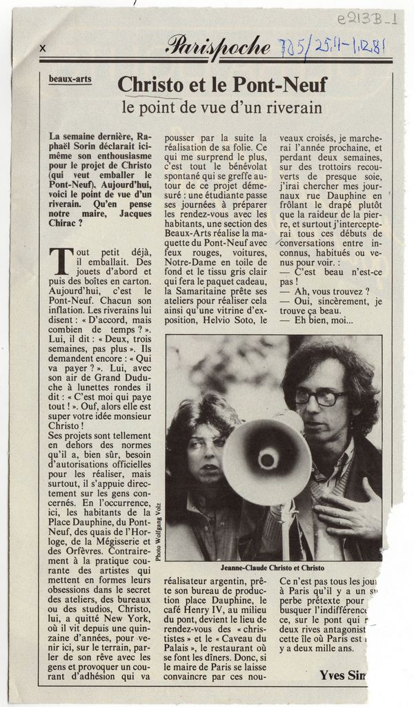Απόκομμα, χαρτί, 23×13 εκ., στα γαλλικά, δημοσίευσης άρθρου το οποίο σχολιάζει εικαστική πρόταση του Christo (Christo Vladimirov Javacheff) για το Pont Neuf στο Παρίσι.