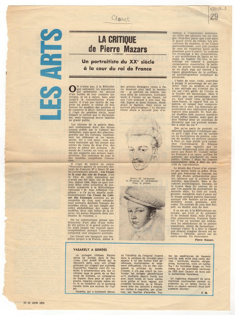 Απόκομμα, χαρτί, 36×27 εκ., στα γαλλικά, δημοσίευσης κριτικής έκθεσης έργων των François και Jean Clouet, στην Εθνική Βιβλιοθήκη του Παρισιού. Αναγράφονται σχόλια για τα έργα των καλλιτεχνών που παρουσιάζονται σε αυτή και δίνονται πληροφορίες για τη διοργάνωση.