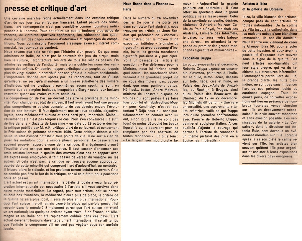 Απόκομμα, έντυπο, χαρτί, 43,0×30,5 εκ., όπου δημοσιεύεται, στα γαλλικά, άρθρο για την κριτική τέχνης στον Σουηδικό τύπο. Επίσης, άρθρο για την κριτική του Jean Bardiot για την αφηρημένη τέχνη, με αφορμή τη διοργάνωση της έκθεσης “Triomphe du figuratif” στο Παρίσι (;), κριτική της έκθεσης του Roberto Crippa σε τρεις βελγικές πόλεις και άρθρο για την καλλιτεχνική επικαιρότητα στην Ίμπιζα. Στην ίδια σελίδα δημοσιεύεται το άρθρο: “Entre la 88e et la 89e avenue le salomon r. guggenheim memorial museum”. Στην πίσω όψη δημοσιεύονται τα εξής άρθρα: “”Manifeste d’Archipenko pour une sculpture polychrome”, “Symposion Europäischer Bildhauer”, “Peinture polonaise au Stedelijk Museum d’Amsterdam” και “Nouvelles oeuvres américaines à la tate gallery”