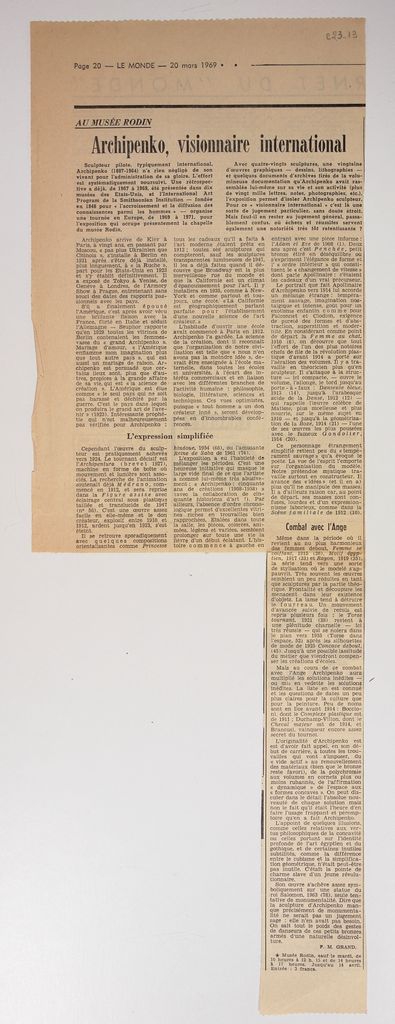 Απόκομμα, έντυπο, χαρτί, 50,0×17,0 εκ., όπου δημοσιεύεται, στα γαλλικά, άρθρο του P.M. Grand για τον γλύπτη Alexander Archipenko με αφορμή την αναδρομική έκθεση έργων του στο Παρίσι το 1969.