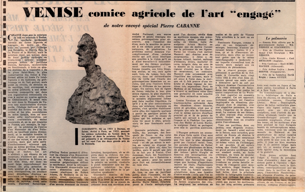 Απόκομμα, έντυπο, χαρτί, 60,0×42,2 εκ., όπου δημοσιεύεται, στα γαλλικά, ανταπόκριση του Pierre Cabanne από την ΧΧΧΙ Μπιενάλε της Βενετίας. Στην ίδια σελίδα δημοσιεύονται τα εξής άρθρα: Raymond Charmet “La vraie jeunesse n’a pas d’âge” (κριτική ατομικών εκθέσεων των E. Bernard και A. Brasilier), Michel Ragon “Géométrie et mouvement” (κριτικές ατομικών εκθέσεων των Vasarely, Mortensen και Soto), σύντομες κριτικές εκθέσεων και αναγγελίες εκθέσεων της περιόδου. Στην άλλη σελίδα, δημοσιεύονται τα άρθρα: Raymond Charmet “”Les figures de Corot” και Germain Bazin με τίτλο “un paysagiste du visage”.