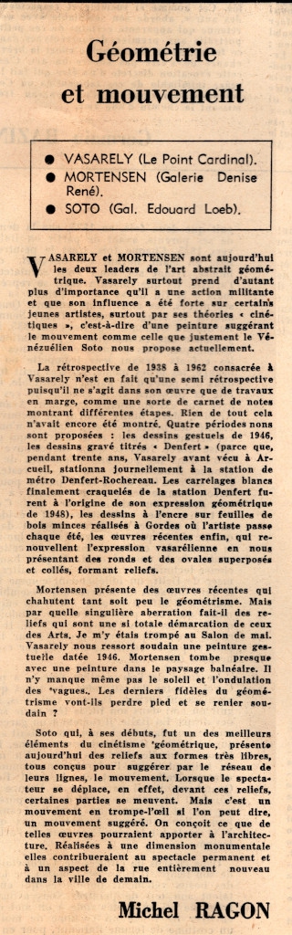 Απόκομμα, έντυπο, χαρτί, 60,0×42,2 εκ., όπου δημοσιεύεται, στα γαλλικά, κριτική του Michel Ragon για τις ατομικές εκθέσεις των Victor Vasarely, Richard Mortensen και Soto στο Παρίσι το καλοκαίρι του 1962. Στην ίδια σελίδα δημοσιεύονται τα εξής άρθρα: Pierre Cabanne “Venise comice agricole de l’art ‘engagé”, Raymond Charmet “La vraie jeunesse n’a pas d’âge” (κριτικές ατομικών εκθέσεων των E. Bernard και A. Brasilier), σύντομες κριτικές εκθέσεων και αναγγελίες εκθέσεων της περιόδου. Στην άλλη σελίδα, δημοσιεύονται τα άρθρα: Raymond Charmet “”Les figures de Corot” και Germain Bazin με τίτλο “un paysagiste du visage”.