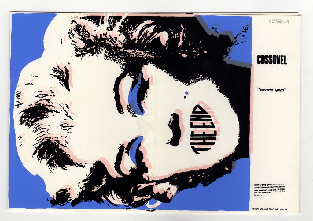 Έντυπο, στα ιταλικά, 15,0×11,2 εκ. Φυλλάδιο για την παραγωγή 130 αριθμημένων μεταξοτυπιών του έργου της Liliana Cossovel “Sincerely yours” από τις Edizioni d’Arte Graziussi-Venezia το 1978. Το έργο παρουσιάστηκε σε θεματική έκθεση έργων του Andy Warhol και της Liliana Cossovel στη Βενετία την Άνοιξη του 1980.