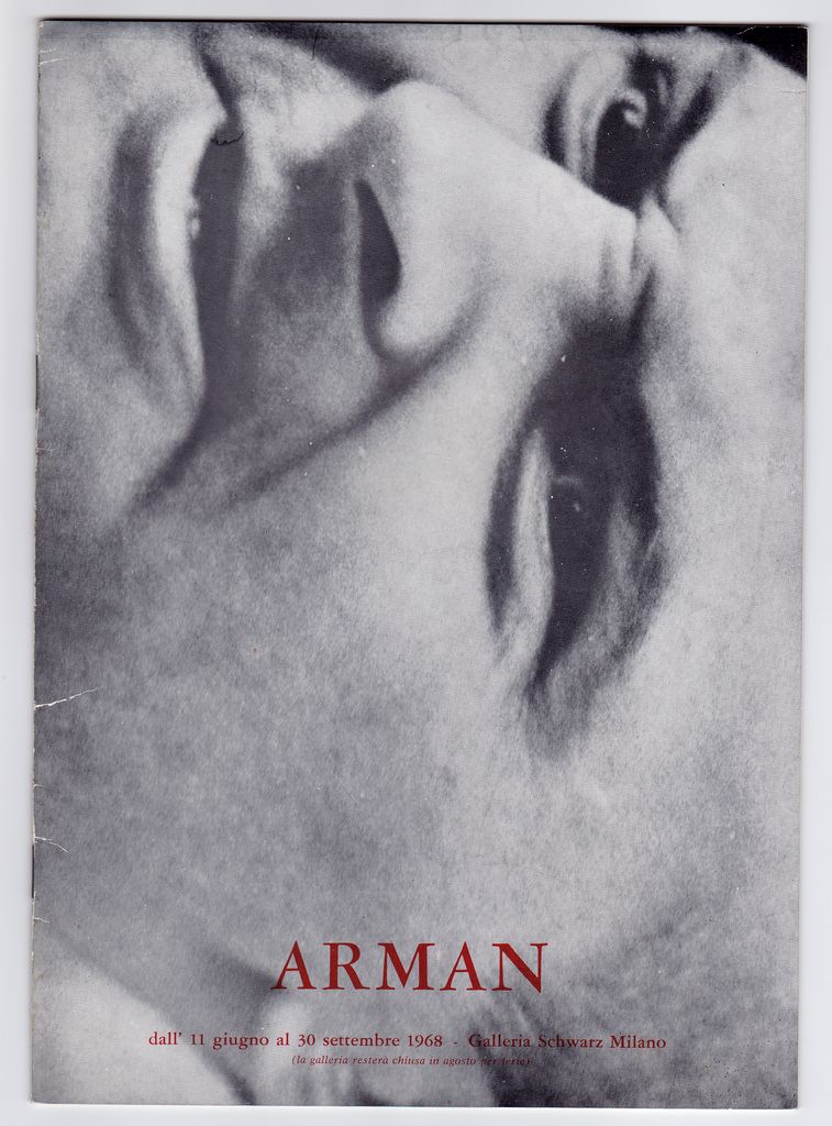 Έντυπο, στα ιταλικά, γαλλικά και αγγλικά, οκτασέλιδο, χαρτί ιλουστρασιόν, 24,0×17,0 εκ. Κατάλογος της ατομικής έκθεσης του Arman στο Μιλάνο το 1968. Περιέχει σύντομο βιογραφικό καλλιτέχνη, κείμενο του Pierre Restany για το έργο του και κατάλογο των έργων της έκθεσης.