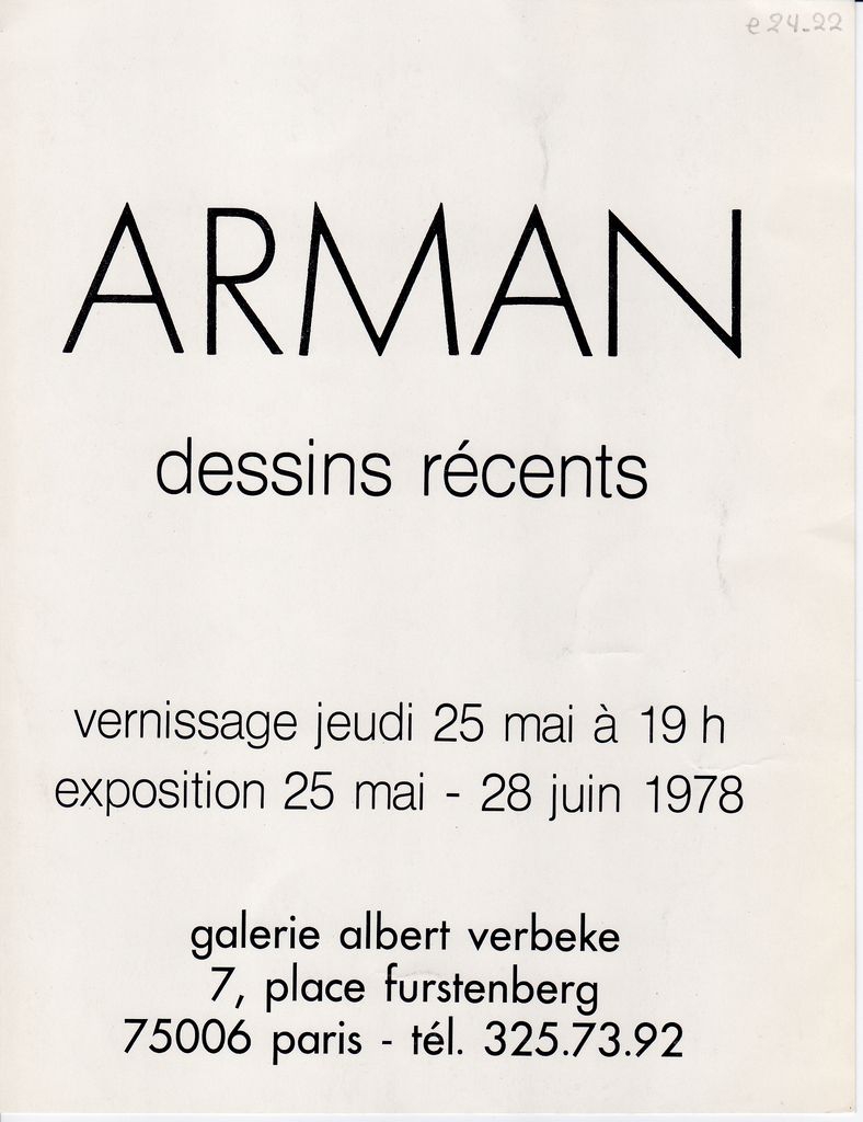 Έντυπο, στα γαλλικά, μονόφυλλο, χαρτόνι ιλουστρασιόν, δύο όψεις, 20,2×15,7 εκ. Αφισέτα της ατομικής έκθεσης του Arman στο Παρίσι το 1978. Στη μία όψη, εικονογράφηση.