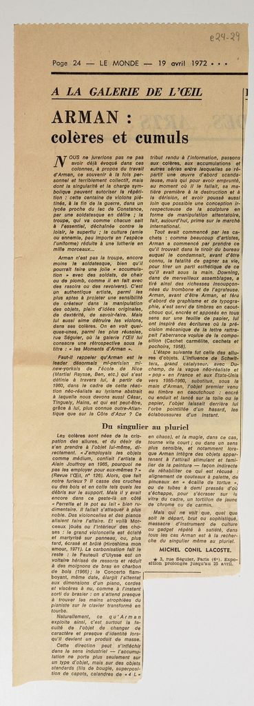 Απόκομμα, έντυπο, χαρτί, 34,0×11,8 εκ., όπου δημοσιεύεται, στα γαλλικά, κριτική του Michel Conil Lacoste για την ατομική έκθεση του Arman στο Παρίσι την άνοιξη του 1972.
