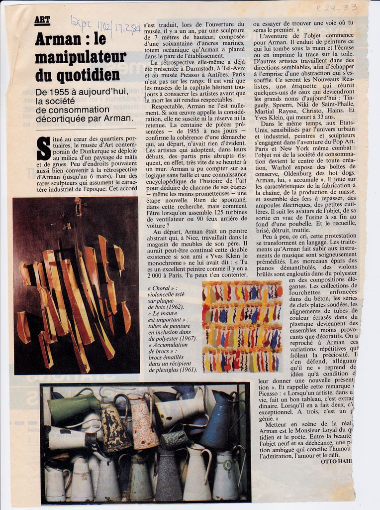 Απόκομμα, έντυπο, χαρτί ιλουστρασιόν, 2,0×20,0 εκ., όπου δημοσιεύεται, στα γαλλικά κριτική του Otto Hahn για την αναδρομική έκθεση του Arman στην Δουνκέρκη το 1984. Επάνω, επιγραφή.
