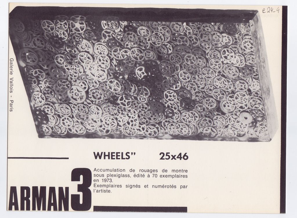 Έντυπο, στα γαλλικά, χαρτόνι, δύο όψεις, 16,0×12,0 εκ. Κάρτα με αναπαραγωγή έργου του εικαστικού καλλιτέχνη Arman. Στην πίσω όψη, λεζάντα με τα στοιχεία της κάρτας: Galerie Valois. 15rue st.Denis Paris 1er. Imrimerie Serg Ivry. © Galerie Vallois Paris.