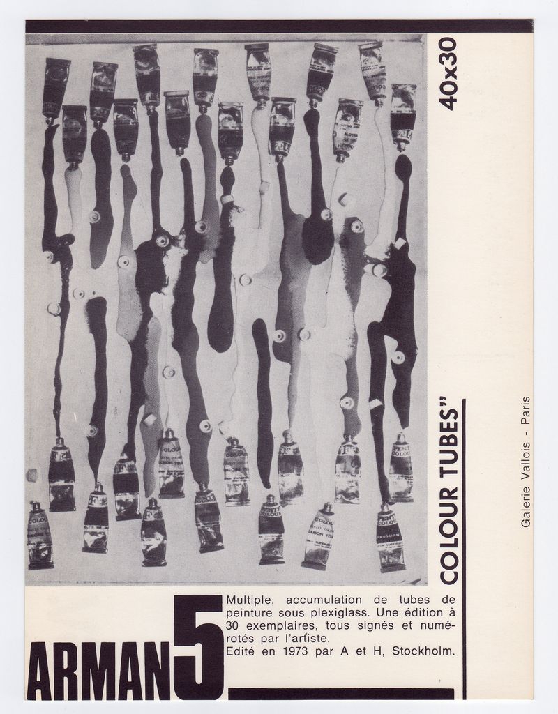 Έντυπο, στα γαλλικά, χαρτόνι, δύο όψεις, 16,0×12,0 εκ. Κάρτα με αναπαραγωγή έργου του εικαστικού καλλιτέχνη Arman. Στην πίσω όψη, λεζάντα με τα στοιχεία της κάρτας: Galerie Valois. 15rue st.Denis Paris 1er. Imrimerie Serg Ivry. © Galerie Vallois Paris.