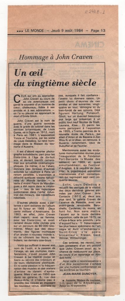 Απόκομμα, χαρτί, 29×11 εκ., στα γαλλικά, δημοσίευσης κριτικής έκθεσης- αφιέρωμα στον John Craven, η οποία διεξάγεται στην Auxerre. Αναγράφονται σχετικές πληροφορίες.