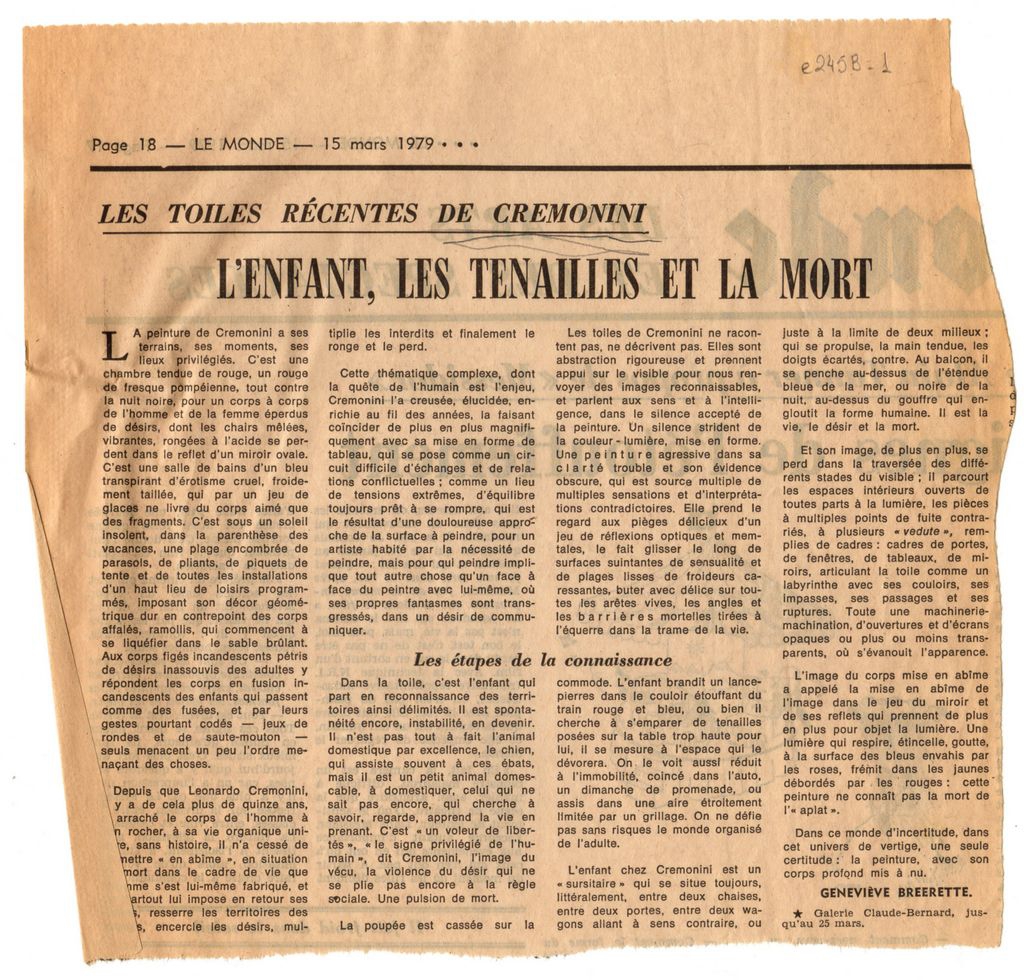 Απόκομμα, χαρτί, 20.5 x21.5 εκ., στα γαλλικά, δημοσίευσης κριτικής έκθεσης του Leonardo Cremonini, η οποία διεξάγεται στην Galerie Claude Bernard στο Παρίσι. Αναγράφονται πληροφορίες για τα έργα που παρουσιάζονται και σχολιάζεται η ζωγραφική του.