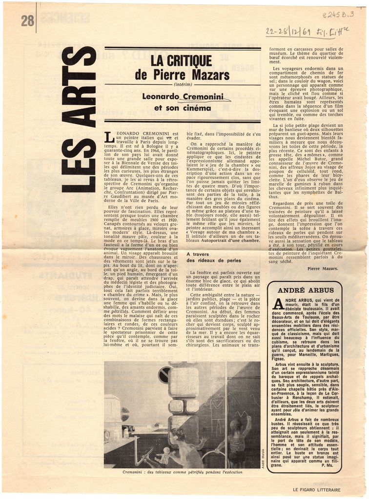 Απόκομμα, χαρτί, 36×27 εκ., στα γαλλικά, δημοσίευσης κριτικής έκθεσης του Leonardo Cremonini, η οποία διεξάγεται στο Μουσείο Μοντέρνας Τέχνης στο Παρίσι. Αναγράφονται λεπτομέρειες για τα έργα που παρουσιάζονται σε αυτή. Στο ίδιο, άρθρο με τίτλο “André Arbus”, αναφερόμενο στον θάνατο του καλλιτέχνη.