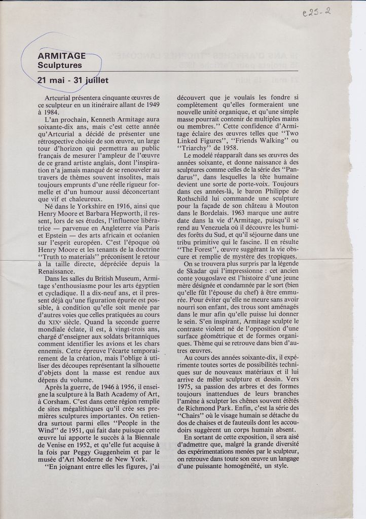 Απόκομμα, έντυπο, χαρτί, 29,5×21,0 εκ., όπου δημοσιεύεται, στα γαλλικά, άρθρο σχετικά με την ατομική έκθεση γλυπτικής του Kenneth Armitage στο Παρίσι το 1985.