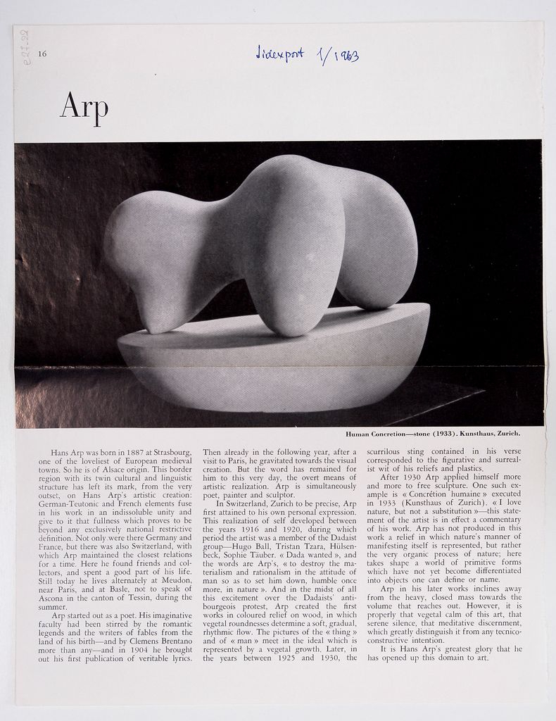 Απόκομμα, έντυπο, χαρτί ιλουστρασιόν, 30,0×23,5 εκ., όπου δημοσιεύεται, στα αγγλικά ανυπόγραφο άρθρο για τον γλύπτη Jean Arp. Επάνω, επιγραφή με τα στοιχεία της δημοσίευσης. Στην άλλη όψη, απόσπασμα άρθρου για τον θεατρικό συγγραφέα Max Frisch.
