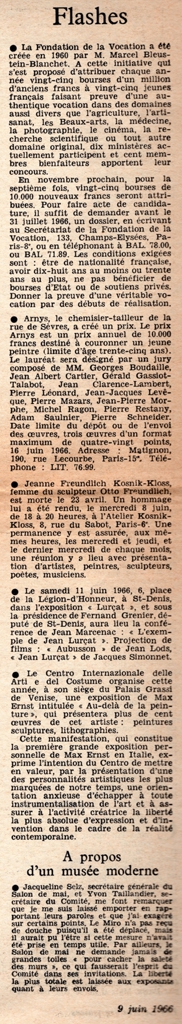 Απόκομμα, έντυπο, χαρτί, 42,3×30,0 εκ., όπου δημοσιεύεται, στα γαλλικά, η στήλη “Flashes” με καλλιτεχνικά νέα και άλλα νέα του Ιουνίου 1966. Περιέχει ειδήσεις για την υποτροφία του Fondation de la Vocation που ιδρύθηκε από τον μεγιστάνα του γαλλικού τύπου M.M. Bleustein-Blanchet, το Βραβείο Arnys. Στο ίδιο απόκομμα δημοσιεύεται επίσης αφιέρωμα στον γλύπρη Jean Arp με αφορμή τον θάνατό του.